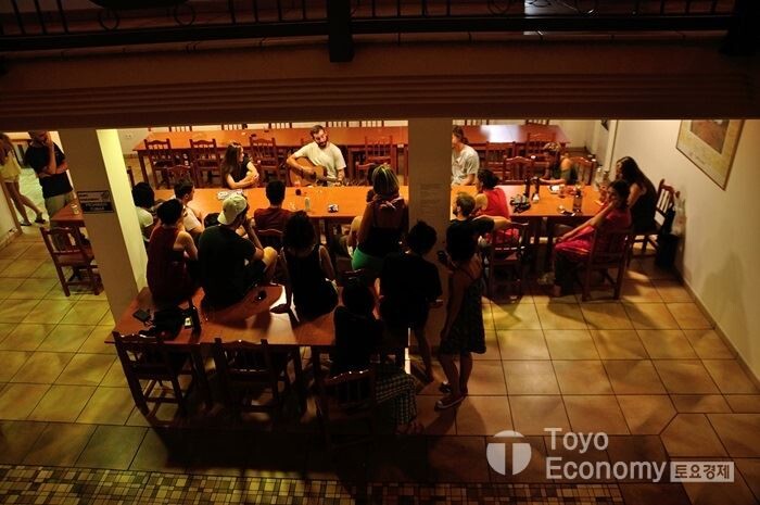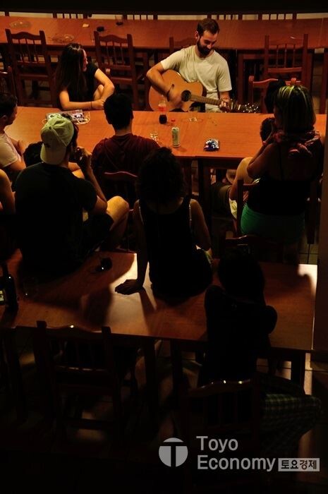 간만에 노트북을 펼치고 순례길에서 찍었던 사진들을 정리하고 글을 쓰기위해 휴대폰에 기록해 두었던 메모를 펼쳐보며 침대에 누웠다. 어느 순간 거실에서 기타치며 노래부르는 소리가 들렸다. 한 곡 끝나면 금방 멈추겠지했는데 2번 째 노래 울려퍼지기 시작했다. 노래 소리에 이끌려 카메라를 들고 침실이 있는 2층 밖에서 아래층이 내려다보이는 난간옆에 덜썩 주저앉아 노래를 듣기 시작했다. 잠시 후 다른 순례자들이 침실에서 나와 나처럼 2층 난간에 자리 잡고 빙 둘러 앉았다. 노래가 끝날때마다 박수가 울려퍼졌고 점점 사람들이 늘어나기 시작했다. 드디어 3번째 노래가 시작되었다. 팝송이다보니 가사는 이해할 수 없었지만 노래선율과 노래부르는 사람의 음색은 무척이나 좋았다. 바로 옆에서 듣는 라이브콘서트마냥 내몸이 들썩 거렸다. 점차 흥이 오른다. 3번째 노래가 끝나고 앵콜을 외쳤지만 더이상의 미니 공연은 이어지지 않았다. 가끔 공립알베르게에 있으면 생각지도 못한 경험을 하게된다. 작은 공연이나 파티같은 저녁식사, 아니면 와인파티가 열리기도 한다. 사립알베르게는 개인적인 휴식을 원하는 사람이 많아 이런 분위기를 경험하기 쉽지 않다. 그래서 나는 공립알베르게를 우선시하며 가려고 한다. 아쉬운점이 있다면, 부족한 영어실력때문에 무언가 공유하는 마음으로 얘기나누고 싶지만 그냥 지나쳐 버리기 일쑤이다. 북쪽길을 걸었을때는 외국인 친구를 많이 만났었다. 한국인도 없었고 봐주어야할 일행도 없었으니까. 하지만 지금은 그렇지 않아서 일지도... 나와 함께하는 동행자들을 생각해야하니까.. . .