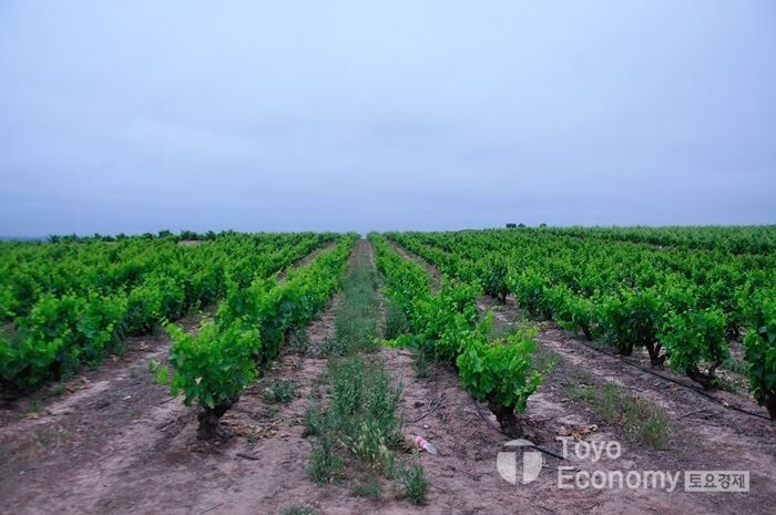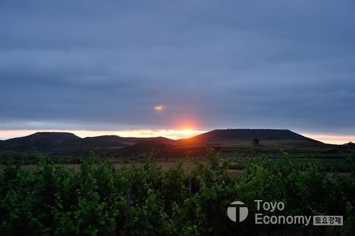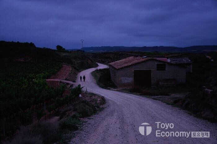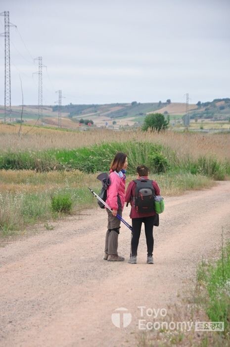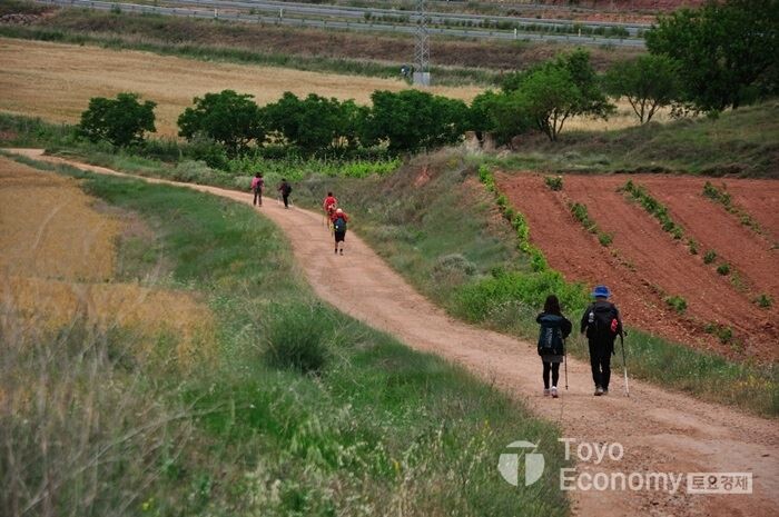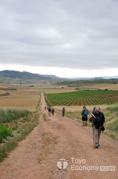 언덕을 넘어서니 낮은 구릉이 연이어진 들판이 펼쳐진다. 이제는 포도밭과 밀밭이 어우러진 풍경이다. 누렇게 익은 황금빛과 햇빛을 머금어 푸르게 변한 포도밭이 대비를 이룬다. 어느때와 같이 쪼리신은 자기만에 속도대로 뒤에서 걷고 있고, 우리는 앞서서 걷고 있다. 게다가 또 한 명이 우리 일행에 포함되었다. 뉴질랜드에서 살고 있다는 한국인 여성이였는데, 전에 Zubiri에서 만났던 적이 있는 분이였다. 무척이나 걷는 것을 힘들어 했었던 분이였는데 포기하지 않고 지금까지 걷고 있고 우리와 동행이 되었다. 때로는 통역역할을 해주어 좀더 편하게 순례길에 집중할 수 있었다.