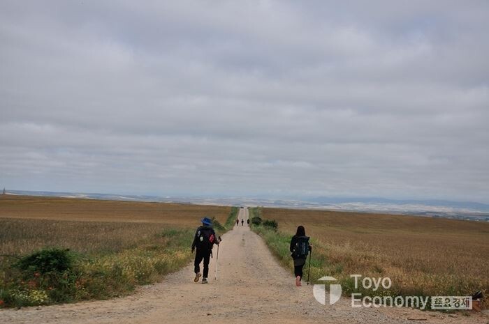 Calzada에 다가 갈수록 점차 해발고도는 높아졌고 700미터를 훌쩍 넘는 언덕을 넘어야 한다. 하지만 평탄하고 오르막 경사가 심하지 않아 내가 이렇게 높게 올라왔다는것을 실감할 수 없다. 오르막이라지만 너무나 쉽게 넘어가는 길이다. 나름 지대가 높다보니 대관령을 넘을때처럼 변화하는 날씨를 만난다. 오르막길을 올라갈때만 해도 구름낀 날씨였는데 능선너머 내리막에 들어서니 해가 떠있는 따가운 날씨로 바뀌었다. 높은 구릉위에서 점차 내려서니 길게 이어진 길이 끝없이 보였다. 그 위로 순례자들이 앞뒤로 촘촘히 붙어서 걸어가는 모습이 한눈에 보인다. 길게 이어진 사람들의 무리가 점처럼 보이다가 어느 사이에 선으로 보였다. 가까이에 보이는 도시가 이제는 꽤나 멀리 있다는것을 경험으로 알고 있다.