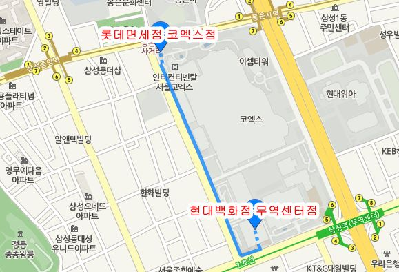 롯데면세점 코엑스점은 인터컨티넨탈 서울 코엑스 지하에 위치해 있어 현대백화점 무역센터점과는 직선거리 700m 이내에 있다.