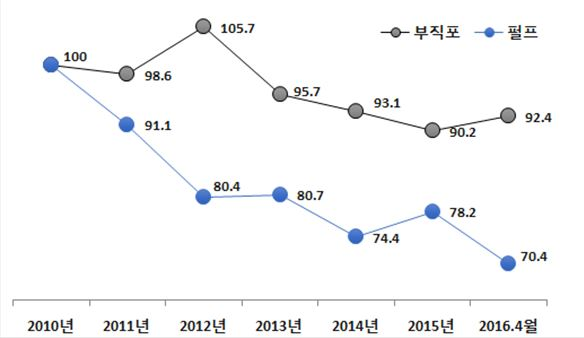 반면 생리대 제조에 사용되는 펄프와 부직포의 수입물가지수는 지속적으로 하락하고 있다는 지적이다. 펄프는 2010년 대비 2016년 4월 현재 29.6% 하락했고, 부직포는 2012년 이후 하양 안정세로 동기간 7.6% 하락하였다.