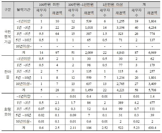 국민행복기금의 중도탈락자는 8만7000여명(6949억원)이고 한마음 5만8000명(5708명), 희망모아 5230명(630억원) 순이다.
