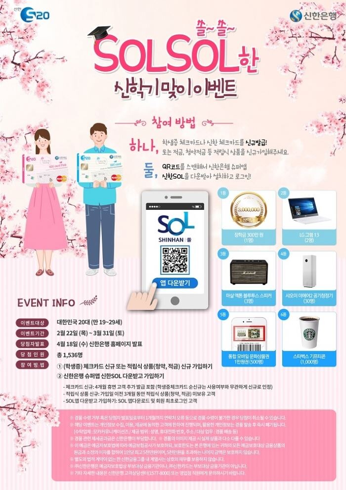 [토요경제=유승열 기자] 신한은행은 20대 고객들을 위한 'SOLSOL(쏠쏠)한 신학기 맞이 이벤트'를 3월 31일까지 실시한다고 26일 밝혔다.
