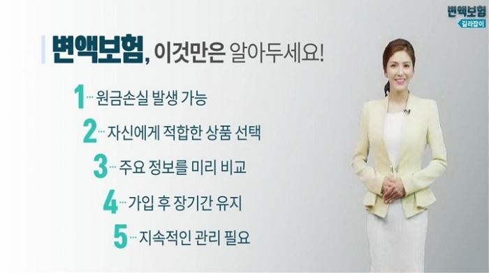 9일 금융감독원과 보험연수원은 변액보험에 가입하고, 관리하는 방법을 소개한 '변액보험 길라잡이' 동영상을 제작했다고 밝혔다. 해당 동영상은 금융소비자정보포털 파인과 보험다모아, 생명보험협회 홈페이지 등을 통해 만나볼 수 있다.