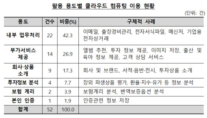금융회사의 클라우드 컴퓨팅 활용 분야는 이메일, 출장경비 관리, 전자서식 파일, 메신저 등 내부 업무처리가 22건(전체의 42.3%)으로 가장 많았다.