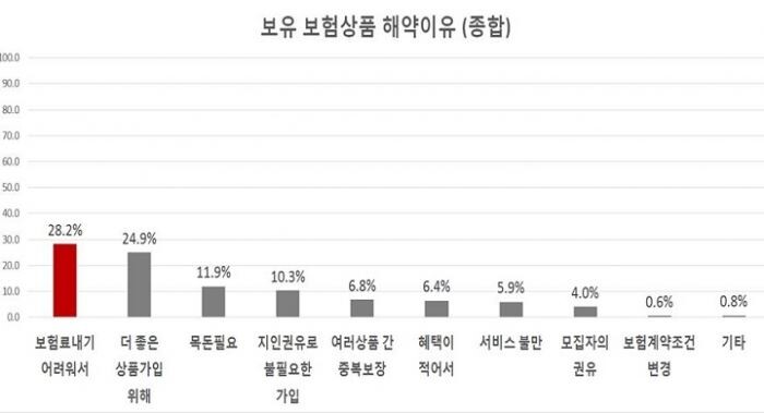 해약한 이유는 '보험료를 내기 어려워서'(28.2%), ' 더 좋은 상품에 가입하기 위해서'(24.9%), '갑자기 목돈이 필요해서'(11.9%)였다.