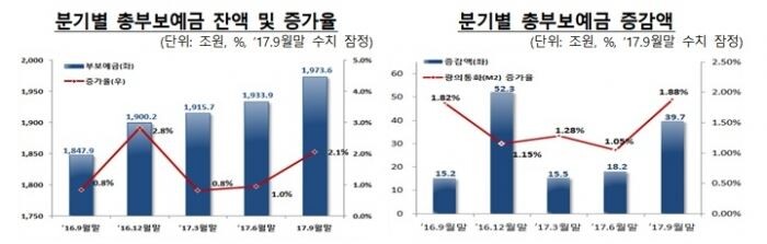 9일 예금보험공사의 '지난해 3분기 예금보험 및 부보금융회사 현황 자료'에 따르면 부보예금(예금보험이 적용되는 예금) 잔액은 지난해 9월말 기준 1973조6000억원으로 직전분기보다 39조7000억원 증가했다.