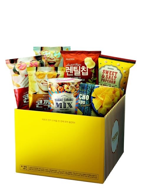 피코크 스낵 선물세트는 나쵸칩 오리지날, 스윗&솔트 팝콘, 씨솔트캬라멜&크림치즈 팝콘 등 7종으로 구성했다.