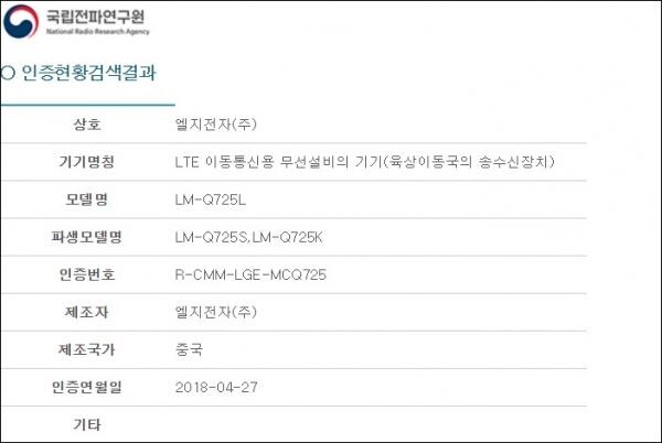 국립전파원에 따르면 지난달 27일 LM-Q725S, LM-Q725K, LM-Q725L, LM-X510S, LM-X510K, LM-X510L 등 6종의 LG전자 단말기가 전파 인증을 통과했다.