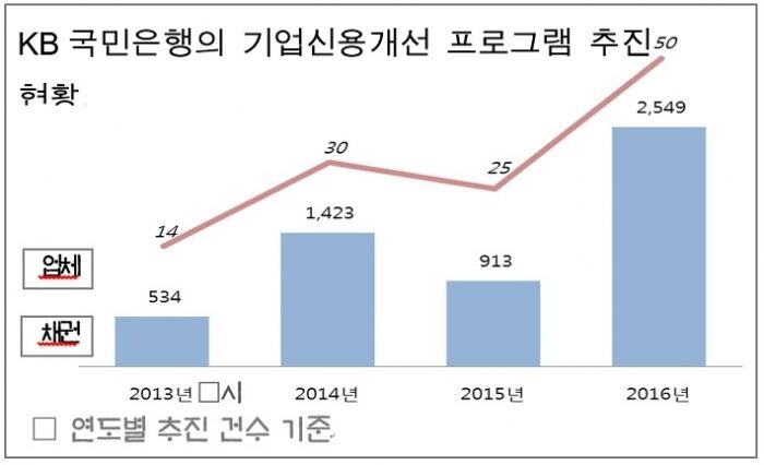 7일 금융권에 따르면 국민은행의 경영 위기에 처한 중소기업 대상으로 하는 '기업신용개선' 추진 실적이 지난해 50개사로 큰폭 증가하며 2013년 시행된 이후 최대치를 기록했다.