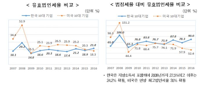 보고서에 따르면 법정세율 대비 유효법인세율에서 2007년부터 2016년까지 10년간 한국은 79.4%, 미국은 71.9%로 국내 기업이 미국보다 법정세율에 가까운 높은 법인세를 내온 것으로 드러났다.