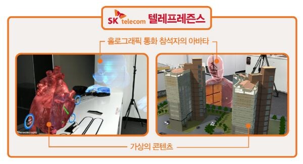 SK텔레콤에 따르면 ‘텔레프레즌스’는 원격지의 회의 참가자들이 실제로 같은 방에 있는 것처럼 느낄 수 있는 증강현실(AR) 기반의 홀로그래픽 통화 솔루션이다.