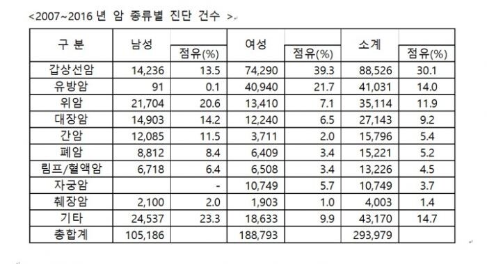 우선 암 진단과 관련해서는 갑상선암이 8만8526건으로 전체의 30.1%를 차지했으며 이어 유방암과 위암 순이었지만 성별에 따른 차이가 큰 것으로 나타났다.