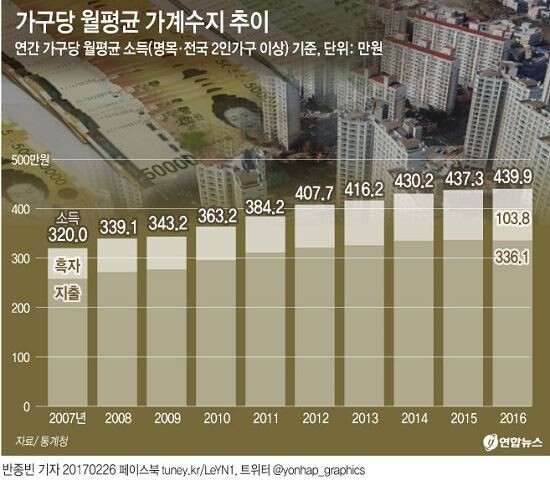26일 통계청에 따르면 지난해 연간 가구당 월평균 소득(명목·전국 2인가구 이상)은 439만9천원이었다.