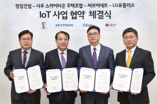 LG유플러스는 청일건설, 스카이타운 주택조합, 홈 네트워크 시스템 개발사인 ‘씨브이넷(CVnet)’과 사업 협약식을 맺고 경기도 김포시 사우동과 감정동에 들어설 ‘김포 사우 스카이타운’ 16개동 1600세대, ‘김포 한강 스카이타운’ 2257세대 등 3857세대에 홈IoT 시스템을 우선 공급키로 했다.