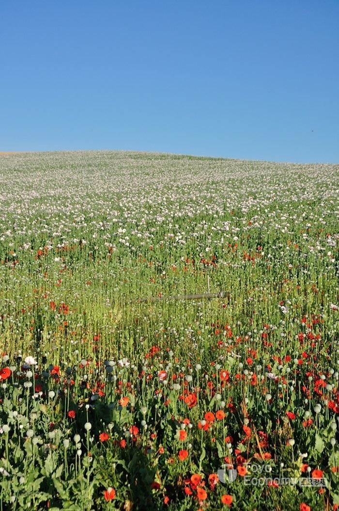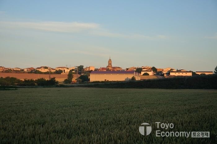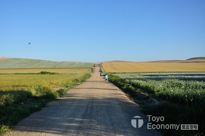Belorado가는 길은 완만한 오르막이다. 내가 오르막길을 가고 있다는 것조차 느낄 수 없을 만큼 완만하고 평이한 길이다. 아직 메세타 평원에 들어서지는 않았지만 평원처럼 넓은 구릉이 계속되는 길이다. 그곳에 무엇이 자라고 있는지가 땅의 색깔을 결정한다. 밀밭이 남은 곳에는 옅은 갈색빛이며, 양귀비가 자라는 곳에는 하얀점과 붉은점이 가득한 붉은빛이 감돈다. 그리고 어느곳은 푸른빛이 감돈다. 멀리서 보면 작은 천을 짜깁기한 식탁보를 펼쳐 놓은 듯 하다.
