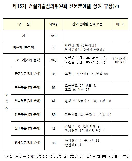 15기 서울시 건설기술심의위원회 전문분야별 정원 구성안