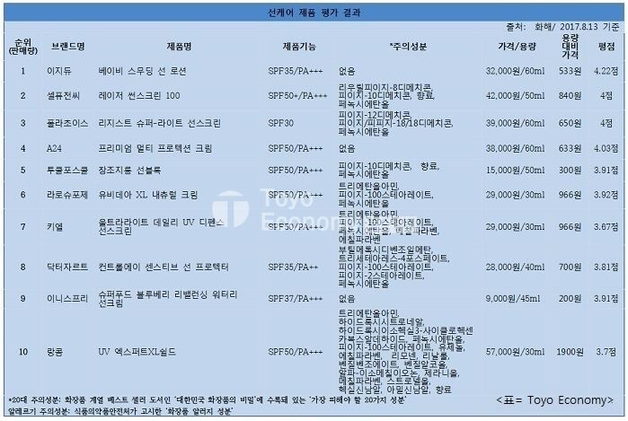 국내 시장에는 다양한 효과와 기능을 가진 국산·수입 선케어 제품들이 홍수처럼 쏟아지고 있다. 그만큼 명확한 기준을 두고 현명한 선케어 제품 선택이 절실하다. 그렇다면 어떤 제품을 선택해야 올바를까. 토요경제는 5년 연속 화장품 관련 1위 어플인 ‘화해’의 자료를 바탕으로 시중 판매량 1~10위의 선케어 제품을 ▲제품기능 ▲주의성분 ▲가격/용량 ▲용량대비가격 ▲평점 등의 기준으로 평가해봤다.