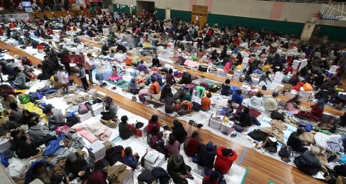 1000여명의 이재민들이 흥해실내체육관에서 피난생활을 하고 있다.<사진=연합뉴스>