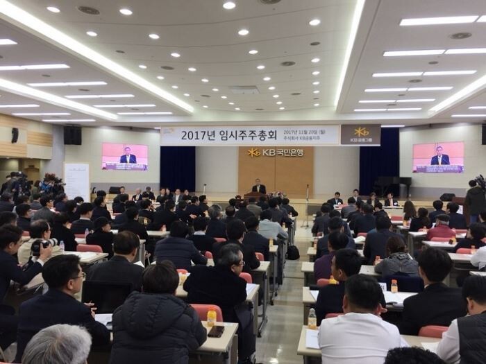 20일 서울 여의도 KB국민은행 본점에서 열린 KB금융 임시 주주총회에서는 ▲사내이사 선임의 건(사내이사후보 윤종규) ▲기타비상무이사 선임의 건(기타비상무이사후보 허인) ▲사외이사 선임의 건(사외이사후보 하승수) ▲정관변경의 건 등이 부의됐다.