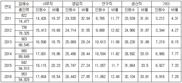 지난해까지 연구직은 1만1862명으로 2011년(8765명) 대비 약 35% 증가했다. 생산직 종사자는 2011년 2만3539명에서 지난해 3만2104명으로 약 36% 늘었다. 반면 사무직·영업직 종사자의 전체 인력비중은 2011년 19.4%에서 2016년 18.5%로, 2011년 32.9%에서 2016년 27.8%로 각각 감소했다.