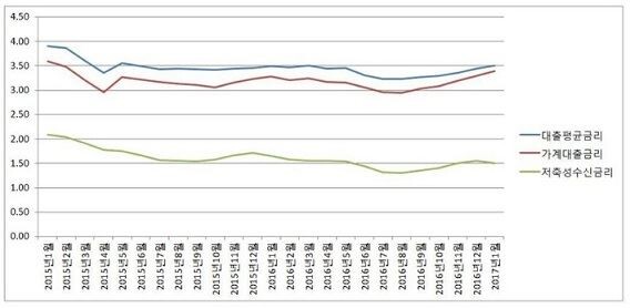 그러나 시장금리와 수신금리 하락에도 1월중 대출 금리는 올랐다. 예금은행의 신규취급액 기준 대출 금리는 연 3.51%로 전달(3.44%) 보다 0.07%포인트, 기업대출 금리는 3.55%포인트로 전달(3.54%)보다 0.01%포인트 올랐다.