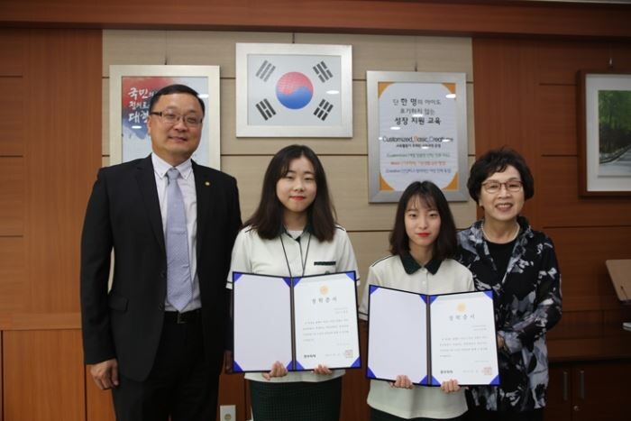 조재면 동부화재 구리사업단 교육팀장(왼쪽)이 장학금 전달 후 정귀숙 구리여고 교장(오른쪽) 등과 기념촬영을 하고 있다.<사진=동부화재>