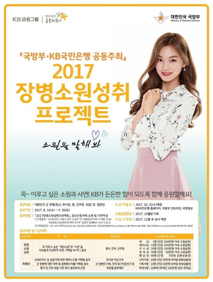 [토요경제=유승열 기자] KB국민은행은 지난 16일부터 다음달 말까지 군 장병 대상 소원실현 프로그램 '2017 장병 소원성취 프로젝트'의 사연을 응모 받는다고 18일 밝혔다.