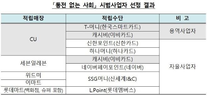 한국은행은 3일 ‘동전없는 사회’ 시범사업자로 총 12개 업체를 선정했다고 밝혔다. 선정된 시범사업자는 씨유(CU), 세븐일레븐, 위드미 등 편의점과 이마트, 롯데마트(백화점, 슈퍼 포함) 등 5개 유통업체와 한국스마트카드(T-머니), 이비카드(캐시비), 신한카드, 하나카드 등 7개 선불사업자다.