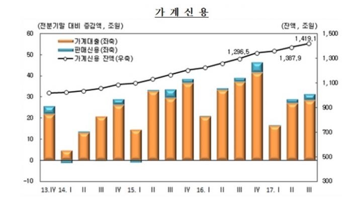 22일 한국은행이 발표한 '3/4분기 중 가계신용(잠정)'에 따르면 지난 9월말 기준 가계신용 잔액은 1419조1000억원으로 3분기 동안 31조2000억원 증가했다.