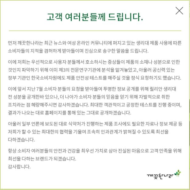 이와 관련해 깨끗한나라는 생리대 부작용 논란에 사과문을 게재했다.