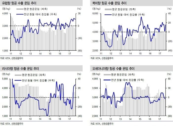 22일 한국무역협회에 따르면, 올해 8월 항공수출 운임은 오세아니아(4.9% 하락)를 제외한 전지역에서 상승세를 보였다. 러시아향 항공수출운임이 전년 동월 대비 27.3% 상승했으며, 그 뒤로 유럽 16.0%, 북미 15.5%, 중동 11.9%, 아프리카 11.7%, 중국 7.2%, 일본 5.2%, 중남미 3.5%가 뒤를 이었다. 이 중 유럽과 북미향 운임은 8개월 연속 상승세를 나타냈다.