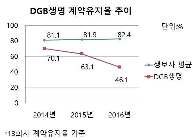 실제로 DGB생명은 보험설계사 이탈, 법보험대리점의 허위계약 문제 등 부침을 겪으면서 지난해말 기준 13회차 계약유지율이 46.1%까지 떨어졌다.