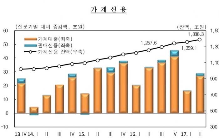 23일 한국은행의 '2017년 2/4분기중 가계신용(잠정)'에 따르면 2분기(4∼6월) 가계부채는 1388조3000억원으로 전분기 말대비 29조2000억원 늘어났다.