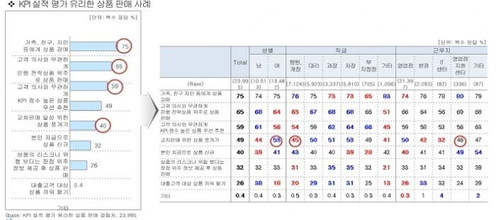 실적평가에 유리한 상품을 판매한 사례(복수 선택)를 살펴보니 75%가 가족·친구·지인 등에게 강매한 것으로 파악됐다.
