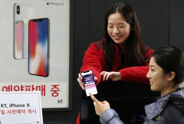 아이폰X가 오는 24일 출시되는 가운데 서울의 한 대형 통신사에서 관계자가 아이폰X 를 설명하고 있다. <사진=연합>