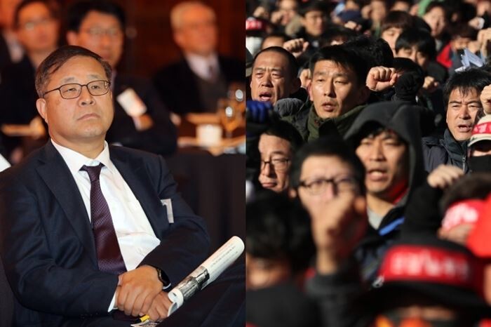 김영배 경총 부회장(왼쪽)과 한국노총 노동자들 모습. <사진=연합>