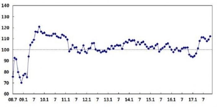 24일 한국은행의 '2017년 11월 소비자동향조사 결과'에 따르면 이달 소비자심리지수(CCSI)는 112.3으로, 2010년 12월(112.7) 이후 6년 11개월 만에 가장 높은 수준을 나타냈다.