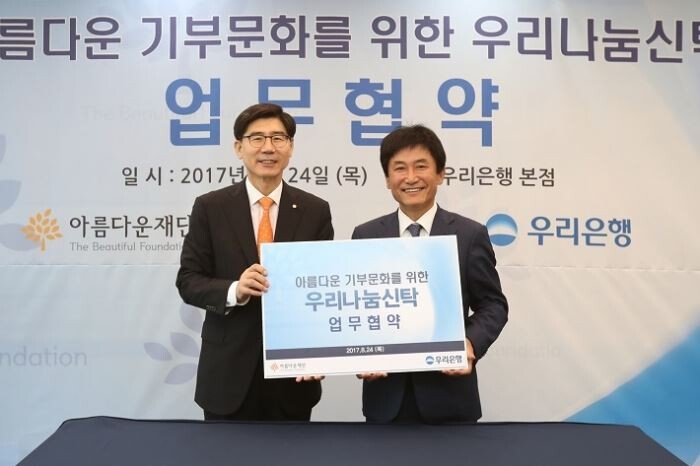 이날 협약은 기부문화 확산을 위해 양 기관의 상호협력을 목적으로 하며, 협약에 따라 우리은행과 아름다운재단은 '우리나눔신탁'을 통해 기부 희망자를 상호 소개하기로 했다.