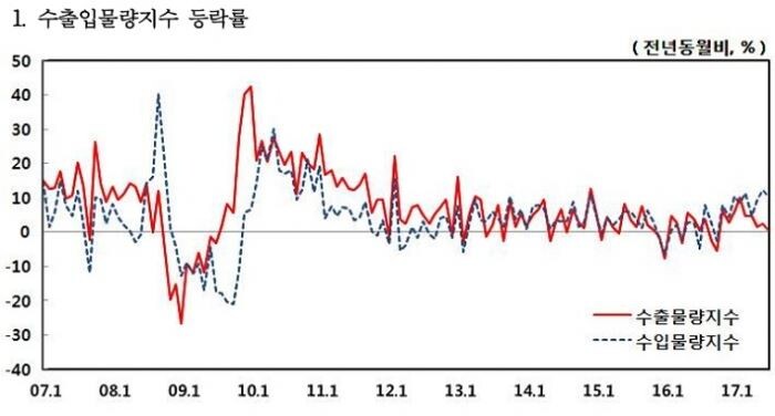 수출물량지수는 전년동월대비로 작년 11월 이래 9개월 연속 상승했다.