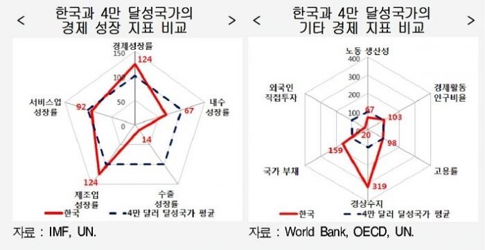 그러나 1인당 GNI 4만달러 달성 국가와 한국을 비교한 결과 한국은 내외수 균형, 과학기술 투자 성과, 노동생산성 측면에서 뒤처지는 것으로 나타났다.