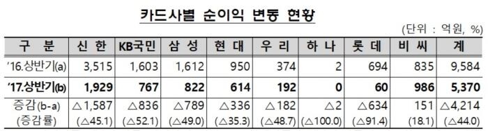 올해 상반기 신용카드사 영업실적에 따르면 상반기 전업카드사의 순이익은 5370억원으로 전년 동기 보다 4214억원 감소했다.