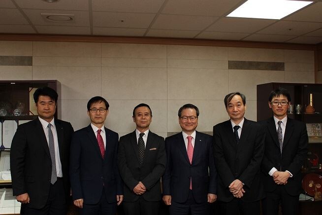 ▲ 좌측부터 심상우 기술연구소 자율차대응TF팀장, 박진호 기술연구소장, 나오토 츠카모토 JKC사장, 성대규 보험개발원장, 히데아키 이노우에 JKC 기술이사, 야스나리 마츠자키 JKC 대외협력 부서장. <사진=보험개발원>