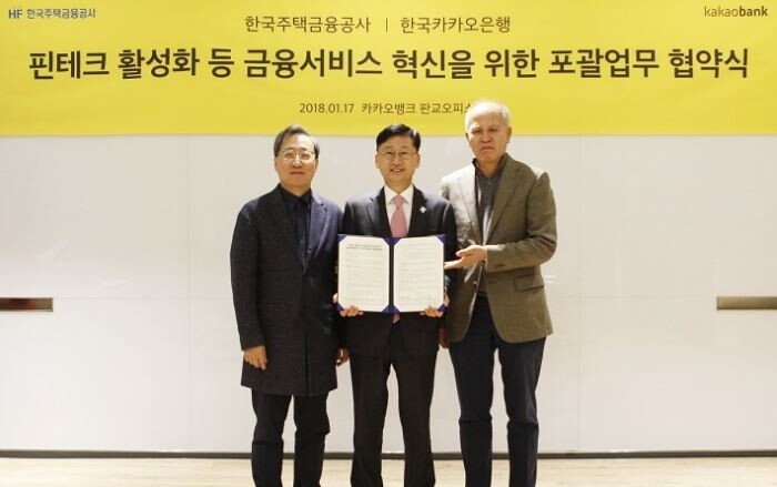 주택금융공사는 한국카카오은행와 17일 '핀테크 활성화 등 금융서비스 혁신을 위한 포괄업무 협약'을 체결했다고 밝혔다.
