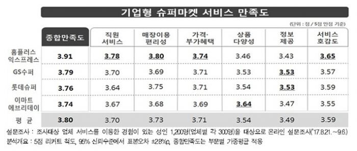 27일 한국소비자원이 8~9월 시장점유율 상위 4개 기업형 슈퍼마켓에 대한 서비스 만족도를 조사한 결과에 따르면 5점 만점인 종합만족도 점수는 홈플러스 익스프레스가 3.91점으로 가장 높았다. 이어 GS수퍼 3.79점, 롯데슈퍼 3.76점, 이마트 에브리데이 3.74점 순이었다.