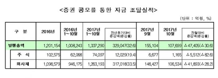 [토요경제=정종진 기자] 기업들이 지난 10월 한달간 공모를 통해 주식·회사채 발행으로 조달한 자금은 총 10조7699억원으로 전월(15조5104억원)대비 30% 가량 감소한 것으로 나타났다.