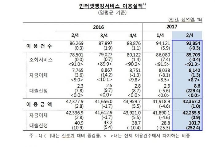 2분기 전체 인터넷뱅킹 이용 건수는 일 평균 9385만건으로 전분기대비 0.3% 감소했다.