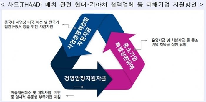 우선 5000억원을 자동차부품 업체 등 사드 배치에 따른 피해기업을 위한 전용자금으로 특별 배정하고 중국 내 사업장 타국 이전, 중국내 한국 기업간 M&A, 타 사업 전환 등을 통한 사업구조 재편 등을 지원대상에 추가한다.