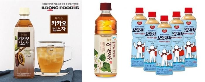 왼쪽부터 일동후디스 ‘후디스 카카오닙스차’, 광동제약 ‘어성초차’, 동원F&B ‘동원 으랏차차’. <사진=각사>