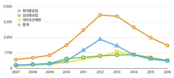 지난해 각 사별로 특허출원 건수를 살펴보면 삼성중공업 898건, 대우조선해양 861건, 현대중공업 834건으로 조선3사 모두 비슷한 수준을 기록했으나 전년 대비 평균 25.4% 급감했다.